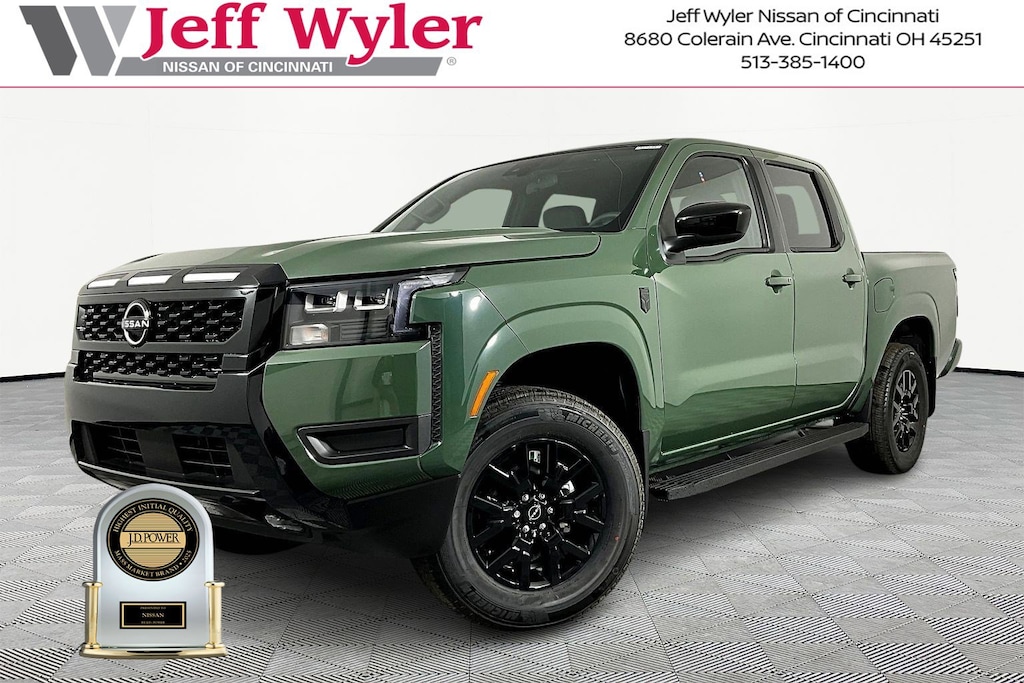 $5,222 off MSRP! Tactical Green Metallic 2026 Nissan Frontier SV 4WD 9-Speed Automatic with Overdrive Jeff Wyler Nissan of Cincinnati is delighted to offer this charming 2026 Nissan Frontier SV in Tactical Green Metallic. Well equipped with: 4WD, 17" Alloy Wheels, 3.692 Axle Ratio, 4-Wheel Disc Brakes, 6 Speakers, ABS brakes, Air Conditioning, Alloy wheels, AM/FM radio: SiriusXM, Anti-whiplash front head restraints, Auto High-beam Headlights, Blind Spot Warning, Brake assist, Bumpers: body-color, Delay-off headlights, Driver door bin, Driver vanity mirror, Dual front impact airbags, Dual front side impact airbags, Electronic Stability Control, Emergency communication system, Front anti-roll bar, Front Bucket Seats, Front Center Armrest, Front reading lights, Front wheel independent suspension, Fully automatic headlights, Illuminated entry, Knee airbag, Low tire pressure warning, Occupant sensing airbag, Overhead airbag, Overhead console, Panic alarm, Passenger door bin, Passenger vanity mirror, Power door mirrors, Power driver seat, Power steering, Power windows, Premium Cloth Seat Trim, Radio data system, Radio: SiriusXM/AM/FM/Auxiliary/USB Audio System, Rear anti-roll bar, Rear seat center armrest, Rear side impact airbag, Rear step bumper, Remote keyless entry, Security system, Speed control, Speed-sensing steering, Split folding rear seat, Steering wheel mounted audio controls, Tachometer, Telescoping steering wheel, Tilt steering wheel, Traction control, Trip computer, Variably intermittent wipers, Voltmeter, and Wireless Apple CarPlay/Wireless Android Auto. V6 4WD.Wyler Family First Package Includes: NanoCure Appearance Protection: Exterior & Interior Chemical Sealant Applied to Protect Against Environmental Hazards (7 Year Warranty Coverage). Pulse- Rear end Collision Avoidance System Theft Deterrent Strategy gives you 5 Years of Coverage against vehicle Theft, Offering up to a $5,000 benefit. Price includes: $3500 - Nissan Customer Cash. Exp. 05/04/2026