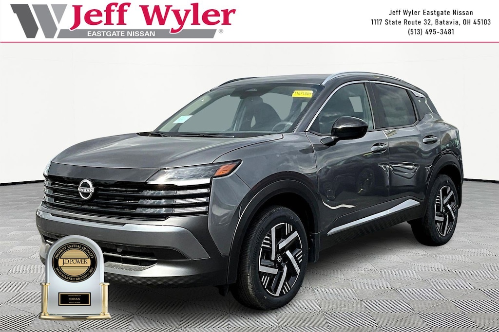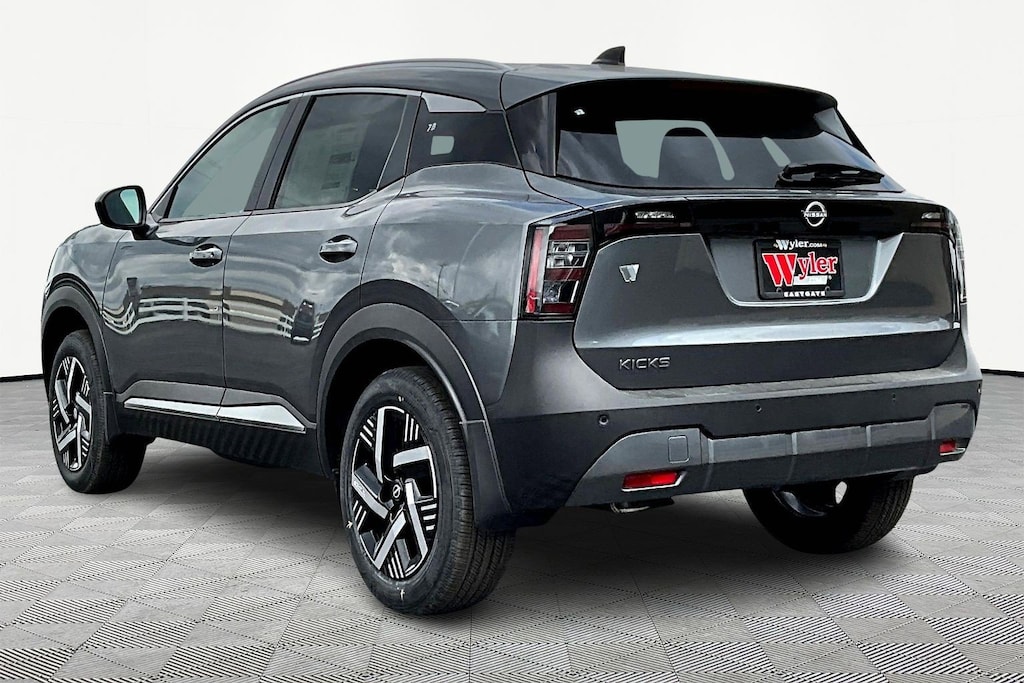 Gun Metallic 2026 Nissan Kicks SV 2.0L DOHC FWD CVT with Xtronic 28/35 City/Highway MPG Jeff Wyler Eastgate Auto Mall is honored to offer this terrific 2026 Nissan Kicks SV in Gun Metallic. Well equipped with: Cold Weather Package (Heated Front Seats, Heated Mirrors, and Rear Floor Heater Ducts), SV Premium Package (Illuminated Driver and Passenger Sun Visors, Panoramic Moonroof, and Sunglass Holder), 4 Speakers, 4-Wheel Disc Brakes, ABS brakes, Air Conditioning, AM/FM radio, Auto High-beam Headlights, Automatic temperature control, Blind Spot Warning, Brake assist, Bumpers: body-color, Carpeted Floor Mats and Underfloor Protector, Cloth Seat Trim, Driver door bin, Driver vanity mirror, Dual front impact airbags, Dual front side impact airbags, Electronic Stability Control, Emergency communication system, Exterior Parking Camera Rear, Front anti-roll bar, Front Bucket Seats, Front Center Armrest, Front reading lights, Front wheel independent suspension, Fully automatic headlights, Illuminated entry, Knee airbag, Low tire pressure warning, NissanConnect featuring Apple CarPlay and Android Auto, Occupant sensing airbag, Outside temperature display, Overhead airbag, Panic alarm, Passenger door bin, Passenger vanity mirror, Power door mirrors, Power steering, Power windows, Radio data system, Radio: AM/FM/SiriusXM Audio System, Rear anti-roll bar, Rear reading lights, Rear side impact airbag, Rear window defroster, Rear window wiper, Remote keyless entry, Security system, Speed control, Speed-sensing steering, Splash Guards, Split folding rear seat, Spoiler, Sport steering wheel, Steering wheel mounted audio controls, Tachometer, Telescoping steering wheel, Tilt steering wheel, Traction control, Trip computer, Variably intermittent wipers, and Wheels: 17" Steel Flex with Full Covers. 28/35 City/Highway MPG Price includes: $1000 - Nissan Customer Cash. Exp. 05/04/2026