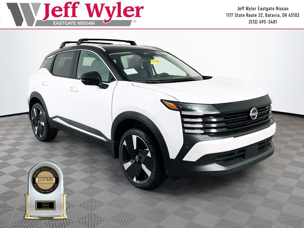 Aspen White Tricoat/Super Black 2026 Nissan Kicks SR 2.0L DOHC AWD CVT with Xtronic 27/34 City/Highway MPG Jeff Wyler Eastgate Auto Mall is excited to offer this fantastic-looking 2026 Nissan Kicks SR in Aspen White Tricoat/Super Black. Well equipped with: Cold Weather Package (Heated Front Seats, Heated Mirrors, and Rear Floor Heater Ducts), 17" Alloy Wheels, 19" Alloy Wheels, 2-Tone Premium Paint, 4-Wheel Disc Brakes, 6 Speakers, ABS brakes, Air Conditioning, Alloy wheels, AM/FM radio, Auto High-beam Headlights, Automatic temperature control, Brake assist, Bumpers: body-color, Carpeted Floor Mats, Crossbars, Delay-off headlights, Driver door bin, Driver vanity mirror, Dual front impact airbags, Dual front side impact airbags, Electronic Stability Control, Emergency communication system: NissanConnect Services, Exterior Parking Camera Rear, Four wheel independent suspension, Front anti-roll bar, Front Bucket Seats, Front Center Armrest, Front reading lights, Fully automatic headlights, Garage door transmitter: myQ Connected Garage, Illuminated entry, Knee airbag, Leather Shift Knob, Leather steering wheel, Low tire pressure warning, NissanConnect featuring Apple CarPlay and Android Auto, Occupant sensing airbag, Outside temperature display, Overhead airbag, Overhead console, Panic alarm, Passenger door bin, Passenger vanity mirror, Power door mirrors, Power steering, Power windows, Radio data system, Radio: AM/FM/SiriusXM Audio System, Rear anti-roll bar, Rear reading lights, Rear seat center armrest, Rear side impact airbag, Rear window defroster, Rear window wiper, Remote keyless entry, Security system, Speed control, Speed-sensing steering, Splash Guards, Split folding rear seat, Spoiler, Sport Leatherette w/Cloth Insert Seat Trim, Sport steering wheel, Steering wheel mounted audio controls, Tachometer, Telescoping steering wheel, Tilt steering wheel, Traction control, Trip computer, Turn signal indicator mirrors, and Variably intermittent wipers. 27/34 City/Highway MPG Price includes: $1000 - Nissan Customer Cash. Exp. 03/02/2026