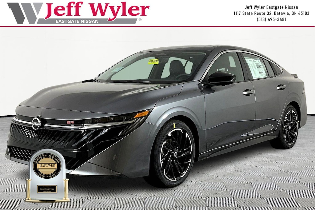 Gun Metallic 2026 Nissan Sentra SR 2.0L I4 DOHC FWD CVT with Xtronic 30/38 City/Highway MPG Jeff Wyler Eastgate Auto Mall is pleased to offer this attractive-looking 2026 Nissan Sentra SR in Gun Metallic. Well equipped with: Floor Mat Package, SR All Weather Package (Dual Zone Auto Climate Control, Heated Front Seats, and Heated Steering Wheel), SR Moonroof Package (Power Tilt Sliding Sunroof with Manual Sunshade), SR Premium Package (6-Way Power Driver's Seat, Auto-Dimming Rear-View Mirror, Bose Premium Audio System, Digital Around View Monitor, Moving Object Detection (MOD), Pro Pilot Assist, Rear Automatic Emergency Braking, Rear Parking Sensor Aid, Sport Leatherette Seat Trim, and Visor DR/AS w/LED Light), 18" Machined Alloy Wheels, 4-Wheel Disc Brakes, 6 Speakers, ABS brakes, Air Conditioning, Alloy wheels, AM/FM radio: Sirius, Auto High-beam Headlights, Automatic temperature control, Brake assist, Bumpers: body-color, Delay-off headlights, Driver door bin, Driver vanity mirror, Dual front impact airbags, Dual front side impact airbags, Electronic Stability Control, Emergency communication system: NissanConnect Services, Four wheel independent suspension, Front anti-roll bar, Front Bucket Seats, Front Center Armrest, Front reading lights, Fully automatic headlights, Garage door transmitter, Heated door mirrors, Illuminated entry, Illuminated Kick Plates, Knee airbag, Leather steering wheel, Low tire pressure warning, Nissan USB Charging Cable Set, Occupant sensing airbag, Outside temperature display, Overhead airbag, Overhead console, Panic alarm, Passenger door bin, Passenger vanity mirror, Power door mirrors, Power steering, Power windows, Radio data system, Radio: AM/FM with RDS/MP3, Rear anti-roll bar, Rear seat center armrest, Rear side impact airbag, Rear window defroster, Remote keyless entry, Security system, Speed control, Speed-sensing steering, Split folding rear seat, Spoiler, Sport Cloth Seat Trim, Steering wheel mounted audio controls, Tachometer, Telescoping steering wheel, Tilt steering wheel, Traction control, Trip computer, Turn signal indicator mirrors, Variably intermittent wipers, and Wireless Apple CarPlay/Wireless Android Auto. 30/38 City/Highway MPG Price includes: $500 - Nissan Customer Cash. Exp. 05/04/2026