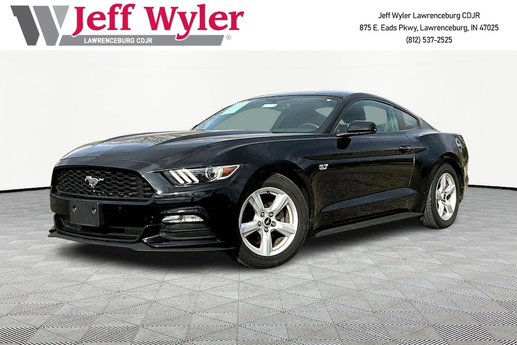 Jeff Wyler Chrysler Dodge Jeep of Lawrenceburg is pumped up to offer this terrific-looking 2017 Ford Mustang V6 in Shadow Black. Equipment Group 050A, 4-Wheel Disc Brakes, 6 Speakers, ABS brakes, Air Conditioning, Alloy wheels, AM/FM radio, AM/FM Stereo w/Single CD Player, Auto-dimming Rear-View mirror, Brake assist, Bumpers: body-color, CD player, Cloth Bucket Seats, Compass, Delay-off headlights, Driver door bin, Driver vanity mirror, Dual front impact airbags, Dual front side impact airbags, Electronic Stability Control, Emergency communication system: 911 Assist, Exterior Parking Camera Rear, Four wheel independent suspension, Front anti-roll bar, Front Bucket Seats, Front Center Armrest, Front reading lights, Fully automatic headlights, High-Intensity Discharge Headlights, Illuminated entry, Knee airbag, Low tire pressure warning, Occupant sensing airbag, Outside temperature display, Overhead airbag, Overhead console, Panic alarm, Passenger door bin, Passenger vanity mirror, Power door mirrors, Power steering, Power windows, Radio data system, Rear anti-roll bar, Rear window defroster, Remote keyless entry, Security system, Speed control, Speed-sensing steering, Speed-Sensitive Wipers, Split folding rear seat, Steering wheel mounted audio controls, SYNC Communications & Entertainment System, Tachometer, Telescoping steering wheel, Tilt steering wheel, Traction control, Trip computer, Variably intermittent wipers, Voltmeter, and Wheels: 17" x 7.5" Sparkle Silver Painted Aluminum Our PRE-OWNED vehicles are put through a rigorous 167- POINT QUALITY ASSURANCE INSPECTION along with an average amount of over $1,400.00 SPENT to recondition each vehicle so we can be sure to deliver you the highest quality vehicle like you deserve! ***ONLINE PRICE DOES NOT INCLUDE WYLER FAMILY FIRST PACKAGE*** Stop by 4136 Shelbyville Road to see for yourself, or give us a call @ 502-897-3151 to schedule your test drive! Ask about available certifications.