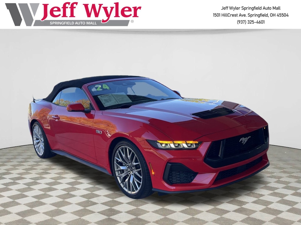 Jeff Wyler Springfield Auto Mall is pleased to offer this handsome 2024 Ford Mustang GT Premium in Race Red. Well equipped with: Equipment Group 401A High Package, Ford Co-Pilot360 Assist+ (B&O Sound System by Bang & Olufsen and Pre-Collision Assist w/Automatic Emergency Braking), Security Package (Active Anti-Theft System, Locking Center Console, and Wheel Locking Kit), 4-Wheel Disc Brakes, 9 Speakers, ABS brakes, Air Conditioning, Alloy wheels, AM/FM radio: SiriusXM with 360L, AM/FM Stereo, Auto High-beam Headlights, Auto-dimming Rear-View mirror, Automatic temperature control, Brake assist, Bumpers: body-color, Climate Controlled Heated/Cooled Front Seats, Compass, Convertible roof lining, Delay-off headlights, Driver door bin, Driver vanity mirror, Dual front impact airbags, Dual front side impact airbags, Electronic Stability Control, Emergency communication system: 911 Assist, Exterior Parking Camera Rear, Four wheel independent suspension, Front anti-roll bar, Front Bucket Seats, Front Center Armrest, Front dual zone A/C, Front reading lights, Fully automatic headlights, Garage door transmitter, Glass rear window, HD Radio, Heated door mirrors, Heated front seats, Heated steering wheel, Illuminated entry, Knee airbag, Leather Shift Knob, Leather steering wheel, Low tire pressure warning, Occupant sensing airbag, Outside temperature display, Overhead console, Panic alarm, Passenger door bin, Passenger vanity mirror, Power convertible roof, Power door mirrors, Power driver seat, Power passenger seat, Power steering, Power windows, Radio data system, Rain sensing wipers, Rear anti-roll bar, Rear Parking Sensors, Rear window defroster, Remote keyless entry, Security system, SiriusXM w/360L, Speed control, Speed-sensing steering, Speed-Sensitive Wipers, Spoiler, Sport steering wheel, Steering wheel mounted audio controls, SYNC 4.0 QNX, Tachometer, Telescoping steering wheel, Tilt steering wheel, Traction control, Trip computer, Turn signal indicator mirrors, Variably intermittent wipers, Ventilated front seats, Voltmeter, Wheels: 19" x 8.5" Shadow Silver-Painted Aluminum, and Wheels: 20" x 9" Premium-Painted Aluminum. Ask about available certifications. Used vehicles 10 years of age or newer with less than 100,000 miles are eligible for the Wyler Assurance Program, but eligible vehicles must pass our reconditioning process and multi-point inspection. Provided the vehicle passes inspection, vehicles will be eligible for the 6 month/6,000 mile limited warranty. The 6 month/6,000 mile limited warranty is NOT available on AS-IS vehicles, wholesale vehicles, lease buyback/pass-thru vehicles or un-inspected vehicles. Note that this program can also apply to vehicles where the remaining factory coverage is less than 6 months or 6,000 miles. Please check the Federal Trade Commission (FTC) Buyers guide on the vehicle for full details as to whether or not warranty coverage may apply. Contact Dealer for additional details. The Wyler Assurance 6 month/6,000 Mile limited warranty ends 6 months from the date of the Retail Purchase Agreement (BUYERS ORDER) or when the vehicle's odometer registers 6,000 additional miles to the mileage listed on the BUYERS ORDER, whichever comes first. Your Deductible - The warranty holder on your contract pays the first $100 of each covered repair.
