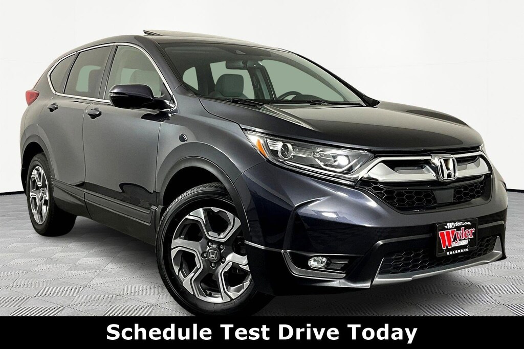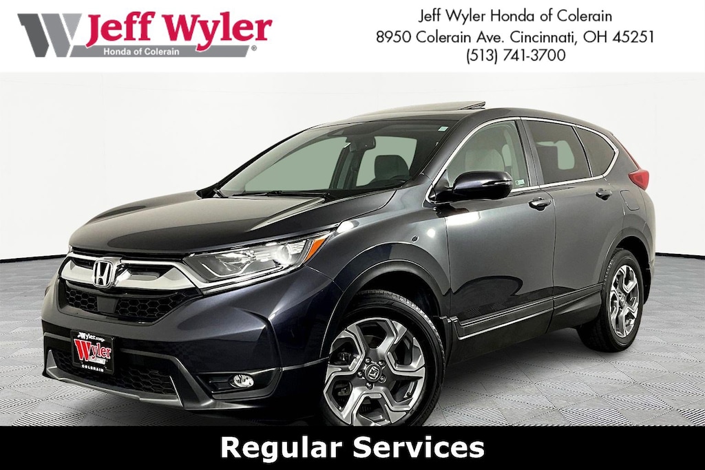 Jeff Wyler Honda of Colerain is excited to offer this handsome 2019 Honda CR-V EX-L in Modern Steel Metallic. Well equipped with: 18" Alloy Wheels, 4-Wheel Disc Brakes, 5.64 Axle Ratio, 8 Speakers, ABS brakes, Air Conditioning, Alloy wheels, AM/FM radio: SiriusXM, Apple CarPlay/Android Auto, Auto High-beam Headlights, Auto-dimming Rear-View mirror, Automatic temperature control, Blind Spot Information (BSI) System warning, Brake assist, Bumpers: body-color, Compass, Delay-off headlights, Driver door bin, Driver vanity mirror, Dual front impact airbags, Dual front side impact airbags, Electronic Stability Control, Exterior Parking Camera Rear, Forward collision: Collision Mitigation Braking System (CMBS) + FCW mitigation, Four wheel independent suspension, Front anti-roll bar, Front Bucket Seats, Front Center Armrest, Front dual zone A/C, Front fog lights, Front reading lights, Fully automatic headlights, Garage door transmitter: HomeLink, Heated door mirrors, Heated Front Bucket Seats, Heated front seats, Illuminated entry, Lane departure: Lane Keeping Assist System (LKAS) active, Leather Seat Trim, Leather Shift Knob, Low tire pressure warning, Memory seat, Occupant sensing airbag, Outside temperature display, Overhead airbag, Overhead console, Panic alarm, Passenger door bin, Passenger vanity mirror, Power door mirrors, Power driver seat, Power Liftgate, Power moonroof, Power passenger seat, Power steering, Power windows, Radio data system, Radio: AM/FM/SiriusXM Audio System, Rear anti-roll bar, Rear seat center armrest, Rear window defroster, Rear window wiper, Remote keyless entry, Security system, Speed control, Speed-sensing steering, Speed-Sensitive Wipers, Split folding rear seat, Spoiler, Steering wheel mounted audio controls, Tachometer, Telescoping steering wheel, Tilt steering wheel, Traction control, Trip computer, Turn signal indicator mirrors, and Variably intermittent wipers.