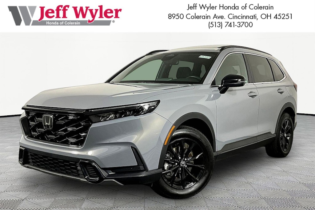 Jeff Wyler Honda of Colerain is pumped up to offer this terrific-looking 2023 Honda CR-V Hybrid Sport in Urban Gray Pearl. Well equipped with: 4-Wheel Disc Brakes, 4.438 Axle Ratio, 6 Speakers, ABS brakes, Adaptive Cruise Control: Adaptive Cruise Control (ACC) with Low-Speed Follow, Air Conditioning, Alloy wheels, Apple CarPlay/Android Auto, Auto High-beam Headlights, Automatic temperature control, Brake assist, Bumpers: body-color, Cloth Seat Trim, Compass, Delay-off headlights, Driver door bin, Driver vanity mirror, Dual front impact airbags, Dual front side impact airbags, Electronic Stability Control, Exterior Parking Camera Rear, Four wheel independent suspension, Front anti-roll bar, Front Bucket Seats, Front Center Armrest, Front dual zone A/C, Front reading lights, Fully automatic headlights, Heated door mirrors, Heated Front Bucket Seats, Heated front seats, Illuminated entry, Knee airbag, Leather Shift Knob, Leather steering wheel, Low tire pressure warning, Occupant sensing airbag, Outside temperature display, Overhead airbag, Overhead console, Panic alarm, Passenger door bin, Passenger vanity mirror, Power door mirrors, Power driver seat, Power moonroof, Power steering, Power windows, Radio data system, Radio: 240-Watt AM/FM Audio System, Rear anti-roll bar, Rear reading lights, Rear seat center armrest, Rear side impact airbag, Rear window defroster, Rear window wiper, Remote keyless entry, Security system, Speed control, Speed-sensing steering, Speed-Sensitive Wipers, Split folding rear seat, Spoiler, Steering wheel mounted audio controls, Telescoping steering wheel, Tilt steering wheel, Traction control, Trip computer, Turn signal indicator mirrors, Variably intermittent wipers, and Wheels: 18" Berlina Black Alloy.