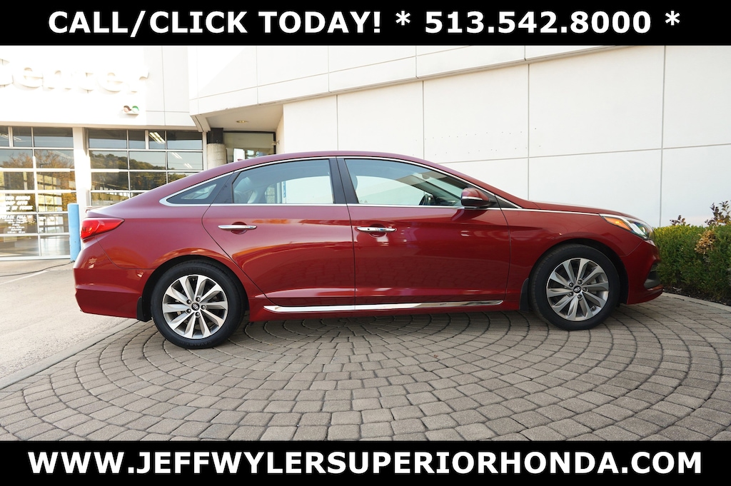 Jeff Wyler Superior Honda is pumped up to offer this attractive 2016 Hyundai Sonata in Venetian Red Metallic. BLUETOOTH, USB ADAPTER, and RECENT SUPERIOR TRADE 4D Sedan, 2.4L I4 DGI DOHC 16V ULEV II 185hp, 6-Speed Automatic with Shiftronic, FWD, Venetian Red Metallic, Gray Cloth, 4-Wheel Disc Brakes, 6 Speakers, ABS brakes, Air Conditioning, Alloy wheels, AM/FM radio: SiriusXM, Brake assist, Bumpers: body-color, Cargo Net, Carpeted Floor Mats, CD player, Driver door bin, Driver vanity mirror, Dual front impact airbags, Dual front side impact airbags, Electronic Stability Control, Four wheel independent suspension, Front anti-roll bar, Front Bucket Seats, Front Center Armrest, Front reading lights, Heated door mirrors, Illuminated entry, Knee airbag, Low tire pressure warning, Occupant sensing airbag, Outside temperature display, Overhead airbag, Overhead console, Panic alarm, Passenger door bin, Passenger vanity mirror, Power door mirrors, Power steering, Power windows, Radio data system, Radio: AM/FM/SiriusXM/CD/MP3 Display Audio, Rear anti-roll bar, Rear Bumper Applique, Rear reading lights, Rear seat center armrest, Rear window defroster, Remote keyless entry, Security system, Speed control, Speed-sensing steering, Speed-Sensitive Wipers, Split folding rear seat, Spoiler, Steering wheel mounted audio controls, Tachometer, Telescoping steering wheel, Tilt steering wheel, Traction control, Trip computer, Variably intermittent wipers, and YES Essentials Premium Cloth Seating Surfaces Our PRE-OWNED vehicles are put through a rigorous 167- POINT QUALITY ASSURANCE INSPECTION along with an average amount of over $1,400.00 SPENT to recondition each vehicle so we can be sure to deliver you the highest quality vehicle like you deserve! ***ONLINE PRICE DOES NOT INCLUDE WYLER FAMILY FIRST PACKAGE*** Stop by 4777 Spring Grove Ave. Road to see for yourself, or give us a call @ 283-209-1858 to schedule your test drive!