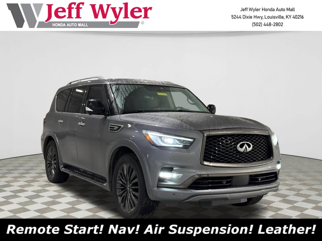 4WD/AWD, Bluetooth, Dual climate Control, Heated Leather Seats, Navigation, Power Sun Roof, Push Button Start, Backup Camera, Third Row Seating, V8 Engine, 13 Speakers, 2.937 Axle Ratio, 3rd row seats: split-bench, 4-Wheel Disc Brakes, ABS brakes, Air Conditioning, All-Season Floor Mats, All-Season Package, Alloy wheels, AM/FM radio: SiriusXM, Anti-whiplash front head restraints, Apple CarPlay/Android Auto, Auto High-beam Headlights, Auto tilt-away steering wheel, Auto-dimming door mirrors, Auto-dimming Rear-View mirror, Auto-leveling suspension, Automatic temperature control, Brake assist, Bumpers: body-color, Cargo Protector, CD player, Compass, Delay-off headlights, Driver door bin, Driver vanity mirror, Dual front impact airbags, Dual front side impact airbags, DVD-Audio, Electronic Stability Control, Emergency communication system: INFINITI Connection, Four wheel independent suspension, Front anti-roll bar, Front Bucket Seats, Front Center Armrest, Front dual zone A/C, Front fog lights, Front reading lights, Fully automatic headlights, Garage door transmitter: HomeLink, Heated door mirrors, Heated Front Bucket Seats, Heated front seats, Heated steering wheel, Illuminated entry, Leather Shift Knob, Leather steering wheel, Leather-Appointed Seats, Literature Kit, Low tire pressure warning, Memory seat, Navigation system: INFINITI InTouch Navigation, Occupant sensing airbag, Outside temperature display, Overhead airbag, Overhead console, Panic alarm, Passenger door bin, Passenger vanity mirror, Power door mirrors, Power driver seat, Power Liftgate, Power moonroof, Power passenger seat, Power steering, Power windows, Premium Select Truffle Brown Interior, Radiant Illuminated Kick Plates, Radio data system, Radio: Bose Audio System w/13 Speakers, Rain sensing wipers, Rear air conditioning, Rear anti-roll bar, Rear audio controls, Rear reading lights, Rear seat center armrest, Rear window defroster, Rear window wiper, Reclining 3rd row seat, Remote keyless entry, Security system, Speed control, Speed-sensing steering, Split folding rear seat, Spoiler, Steering wheel memory, Steering wheel mounted audio controls, Tachometer, Telescoping steering wheel, Tilt steering wheel, Traction control, Trip computer, Turn signal indicator mirrors, Variably intermittent wipers, Voltmeter, Wheels: 22" x 8.0" Dark Forged Aluminum-Alloy. 4WD 7-Speed Automatic 5.6L V8Recent Arrival!13/19 City/Highway MPGAsk about available certifications.