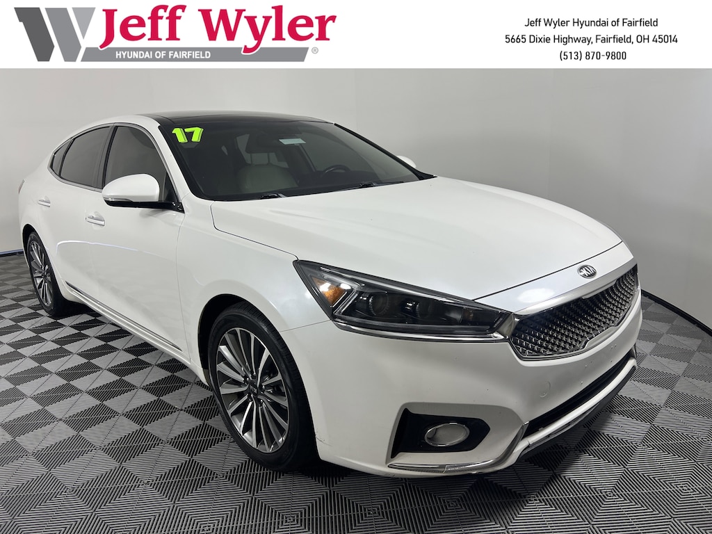 Clean CARFAX. Jeff Wyler Hyundai of Fairfield is excited to offer this fantastic 2017 Kia Cadenza Premium in Snow White Pearl. Well equipped with: Luxury Package (Auto-Dimming Rear-View Mirror, Blind Spot Detection, Front Door Pocket Lights, Lane Change Assist, Power Folding Outside Mirrors, Radio: harman/kardon Audio w/AM/FM/CD/MP3/NAV, Rear Cross Traffic Alert (RCTA), and Rear Park Assist System), Android Auto, Apple CarPlay, CALL NOW FOR YOUR VIP APPOINTMENT 513-870-9800, FULLY SERVICED w/RECORDS, GUARANTEED FINANCING!! NO MATTER YOUR SITUATION WE CAN GET AN APPROVAL!!, THE #1 Volume dealer in the region! Come see why for yourself Today!!, WE PAY MORE FOR YOUR TRADE!!, 18" Alloy Wheels, 4-Wheel Disc Brakes, 8 Speakers, ABS brakes, Air Conditioning, Alloy wheels, AM/FM radio: SiriusXM, Apple CarPlay & Android Auto, Auto-dimming Rear-View mirror, Automatic temperature control, Brake assist, Bumpers: body-color, Cargo Mat, Cargo Net, Delay-off headlights, Driver door bin, Driver vanity mirror, Dual front impact airbags, Dual front side impact airbags, Electronic Stability Control, Exterior Parking Camera Rear, Four wheel independent suspension, Front anti-roll bar, Front Bucket Seats, Front Center Armrest, Front dual zone A/C, Front fog lights, Front reading lights, Fully automatic headlights, Heated door mirrors, Heated Front Bucket Seats, Heated front seats, Illuminated entry, Knee airbag, Leather Seat Trim, Leather Shift Knob, LED Interior Lighting, Low tire pressure warning, Occupant sensing airbag, Outside temperature display, Overhead airbag, Overhead console, Panic alarm, Panoramic Sunroof w/Power Sunshade, Passenger door bin, Passenger vanity mirror, Power door mirrors, Power driver seat, Power passenger seat, Power steering, Power windows, Radio data system, Radio: UVO3 Audio System AM/FM/MP3, Rear reading lights, Rear seat center armrest, Rear side impact airbag, Rear window defroster, Remote keyless entry, Security system, Speed control, Steering wheel mounted audio controls, Tachometer, Telescoping steering wheel, Tilt steering wheel, Traction control, Trip computer, Turn signal indicator mirrors, Variably intermittent wipers, and Wheel Locks. Reviews: * Well-equipped for the price, especially in the base Premium trim; vast amount of legroom allows all passengers to stretch out; generous warranty coverage; lots of available advanced safety features Source: EdmundsTO CHECK ON THE AVAILABILITY OF THIS VEHICLE REACH OUT TO ONE OF OUR TEAM MEMBERS!! ALSO SHOP ONLINE AT https://www.jeffwylerhyundaioffairfield.com/ Proudly Serving: Cincinnati, Dayton, Columbus, Louisville, Lexington, Indianapolis, Hamilton, Florence, Alexandria, Beavercreek, Springdale, West Chester, Monroe, Fairfield, Kenwood, Newport and all of greater Cincinnati Ohio, Indiana, and Northern Kentucky.