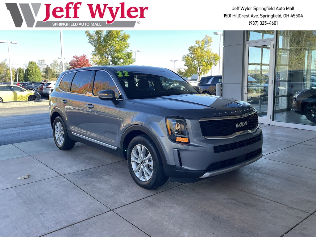 Jeff Wyler Springfield Auto Mall is excited to offer this superb 2022 Kia Telluride LX in Everlasting Silver. Well equipped with: 3.648 Axle Ratio, 3rd row seats: split-bench, 4-Wheel Disc Brakes, 6 Speakers, ABS brakes, Air Conditioning, Alloy wheels, AM/FM radio: SiriusXM, Apple CarPlay & Android Auto, Automatic temperature control, Brake assist, Bumpers: body-color, Cargo Seatback Up Mat, Delay-off headlights, Driver door bin, Driver vanity mirror, Dual front impact airbags, Dual front side impact airbags, EC Mirror w/Compass & HomeLink, Electronic Stability Control, Emergency communication system: 911 Connect, Four wheel independent suspension, Front anti-roll bar, Front Bucket Seats, Front Center Armrest, Front dual zone A/C, Front reading lights, Fully automatic headlights, Heated door mirrors, Hybrid Cargo Net, Illuminated entry, Knee airbag, Leather steering wheel, Low tire pressure warning, Navigation System, Occupant sensing airbag, Outside temperature display, Overhead airbag, Overhead console, Panic alarm, Passenger door bin, Passenger vanity mirror, Power door mirrors, Power steering, Power windows, Radio data system, Radio: AM/FM Display Audio System, Rear air conditioning, Rear anti-roll bar, Rear audio controls, Rear reading lights, Rear seat center armrest, Rear window defroster, Rear window wiper, Reclining 3rd row seat, Remote keyless entry, Security system, Smart Key w/ Push Button and Remote Start, Speed control, Speed-sensing steering, Split folding rear seat, Spoiler, Steering wheel mounted audio controls, Synthetic Leather Seat Trim, Tachometer, Telescoping steering wheel, Tilt steering wheel, Traction control, Trip computer, Turn signal indicator mirrors, Variably intermittent wipers, and Wheels: 18" x 7.5" Painted Alloy. Ask about available certifications. Used vehicles 10 years of age or newer with less than 100,000 miles are eligible for the Wyler Assurance Program, but eligible vehicles must pass our reconditioning process and multi-point inspection. Provided the vehicle passes inspection, vehicles will be eligible for the 6 month/6,000 mile limited warranty. The 6 month/6,000 mile limited warranty is NOT available on AS-IS vehicles, wholesale vehicles, lease buyback/pass-thru vehicles or un-inspected vehicles. Note that this program can also apply to vehicles where the remaining factory coverage is less than 6 months or 6,000 miles. Please check the Federal Trade Commission (FTC) Buyers guide on the vehicle for full details as to whether or not warranty coverage may apply. Contact Dealer for additional details. The Wyler Assurance 6 month/6,000 Mile limited warranty ends 6 months from the date of the Retail Purchase Agreement (BUYERS ORDER) or when the vehicle's odometer registers 6,000 additional miles to the mileage listed on the BUYERS ORDER, whichever comes first. Your Deductible - The warranty holder on your contract pays the first $100 of each covered repair.