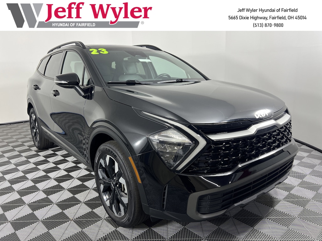 CARFAX One-Owner. Jeff Wyler Hyundai of Fairfield is very proud to offer this charming 2023 Kia Sportage X-Line in Ebony Black. Well equipped with: Sage Green Interior Color Package, X-Line Premium Package (LED Interior Lighting, Panoramic Sunroof, and Smart Power Liftgate), AWD, Android Auto, Apple CarPlay, CALL NOW FOR YOUR VIP APPOINTMENT 513-870-9800, FULLY SERVICED w/RECORDS, GUARANTEED FINANCING!! NO MATTER YOUR SITUATION WE CAN GET AN APPROVAL!!, THE #1 Volume dealer in the region! Come see why for yourself Today!!, WE PAY MORE FOR YOUR TRADE!!, 4-Wheel Disc Brakes, 6 Speakers, ABS brakes, Air Conditioning, Alloy wheels, AM/FM radio: SiriusXM, Apple CarPlay & Android Auto, Auto High-beam Headlights, Automatic temperature control, Axle Ratio: 3.648, Brake assist, Bumpers: body-color, Cargo Cover, Cargo Net Hybrid w/o Audio, Compass, Delay-off headlights, Driver door bin, Driver vanity mirror, Dual front impact airbags, Dual front side impact airbags, Electronic Stability Control, Emergency communication system, Four wheel independent suspension, Front anti-roll bar, Front Bucket Seats, Front Center Armrest, Front dual zone A/C, Fully automatic headlights, harman/kardon® Speakers, Heated door mirrors, Heated Front Bucket Seats, Heated front seats, Illuminated entry, Leather Shift Knob, Leather steering wheel, Low tire pressure warning, Navigation System, Occupant sensing airbag, Outside temperature display, Overhead airbag, Overhead console, Panic alarm, Passenger door bin, Passenger vanity mirror, Power door mirrors, Power driver seat, Power steering, Power windows, Premium Leatherette Seat Trim, Radio: AM/FM/HD Audio System, Rain sensing wipers, Rear anti-roll bar, Rear seat center armrest, Rear window defroster, Rear window wiper, Remote keyless entry, Security system, Speed control, Speed-sensing steering, Split folding rear seat, Spoiler, Steering wheel mounted audio controls, Tachometer, Telescoping steering wheel, Tilt steering wheel, Traction control, Trip computer, Turn signal indicator mirrors, Variably intermittent wipers, Wheel Locks, and Wheels: 19" Gloss Black Alloy. TO CHECK ON THE AVAILABILITY OF THIS VEHICLE REACH OUT TO ONE OF OUR TEAM MEMBERS!! ALSO SHOP ONLINE AT https://www.jeffwylerhyundaioffairfield.com/ Proudly Serving: Cincinnati, Dayton, Columbus, Louisville, Lexington, Indianapolis, Hamilton, Florence, Alexandria, Beavercreek, Springdale, West Chester, Monroe, Fairfield, Kenwood, Newport and all of greater Cincinnati Ohio, Indiana, and Northern Kentucky.