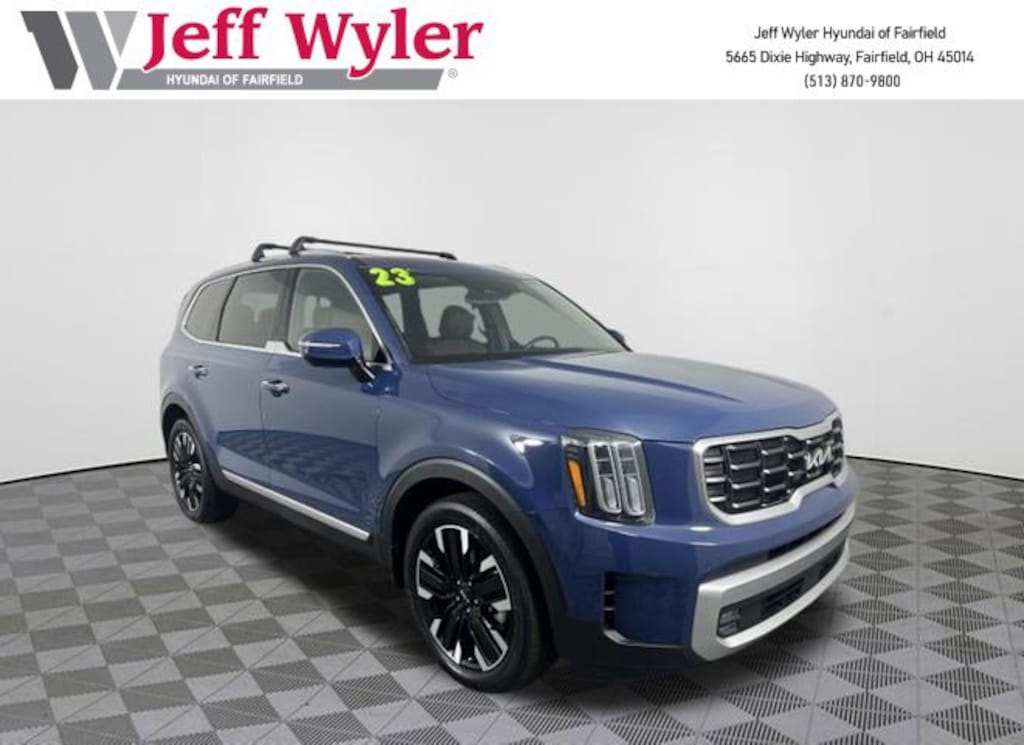 CARFAX One-Owner. Jeff Wyler Hyundai of Fairfield is proud to offer this terrific 2023 Kia Telluride SX in Midnight Lake Blue. Well equipped with: Mahogany Interior Color Package, Android Auto, Apple CarPlay, CALL NOW FOR YOUR VIP APPOINTMENT 513-870-9800, FULLY SERVICED w/RECORDS, GUARANTEED FINANCING!! NO MATTER YOUR SITUATION WE CAN GET AN APPROVAL!!, THE #1 Volume dealer in the region! Come see why for yourself Today!!, WE PAY MORE FOR YOUR TRADE!!, 10 Speakers, 3.648 Axle Ratio, 3rd row seats: split-bench, 4-Wheel Disc Brakes, ABS brakes, Air Conditioning, Alloy wheels, AM/FM radio: SiriusXM, Apple CarPlay & Android Auto, Auto High-beam Headlights, Auto-dimming Rear-View mirror, Automatic temperature control, Brake assist, Bumpers: body-color, Cargo Cover, Carpet Floor Mats, Compass, Delay-off headlights, Driver door bin, Driver vanity mirror, Dual front impact airbags, Dual front side impact airbags, Electronic Stability Control, Emergency communication system: 911 Connect, Exterior Parking Camera Rear, Four wheel independent suspension, Front anti-roll bar, Front Bucket Seats, Front Center Armrest, Front dual zone A/C, Front fog lights, Front reading lights, Fully automatic headlights, Garage door transmitter: HomeLink, harman/kardon® Speakers, Heated & Ventilated Front Bucket Seats, Heated door mirrors, Heated front seats, Heated steering wheel, Illuminated entry, Knee airbag, Leather Seat Trim, Leather Shift Knob, Leather steering wheel, Low tire pressure warning, Memory seat, Mud Guard Kit, Navigation System, Occupant sensing airbag, Outside temperature display, Overhead airbag, Overhead console, Panic alarm, Passenger door bin, Passenger vanity mirror, Power door mirrors, Power driver seat, Power Liftgate, Power moonroof, Power passenger seat, Power steering, Power windows, Radio data system, Radio: AM/FM harman/kardon Audio System, Rear air conditioning, Rear anti-roll bar, Rear audio controls, Rear reading lights, Rear side impact airbag, Rear window defroster, Rear window wiper, Reclining 3rd row seat, Remote keyless entry, Roof rack: rails only, Security system, Smart Key w/ Push Button and Remote Start, Speed control, Speed-sensing steering, Split folding rear seat, Spoiler, Steering wheel mounted audio controls, Tachometer, Telescoping steering wheel, Tilt steering wheel, Traction control, Trip computer, Turn signal indicator mirrors, Variably intermittent wipers, Ventilated front seats, and Wheels: 20" x 7.5" Black Finish. TO CHECK ON THE AVAILABILITY OF THIS VEHICLE REACH OUT TO ONE OF OUR TEAM MEMBERS!! ALSO SHOP ONLINE AT https://www.jeffwylerhyundaioffairfield.com/ Proudly Serving: Cincinnati, Dayton, Columbus, Louisville, Lexington, Indianapolis, Hamilton, Florence, Alexandria, Beavercreek, Springdale, West Chester, Monroe, Fairfield, Kenwood, Newport and all of greater Cincinnati Ohio, Indiana, and Northern Kentucky.
