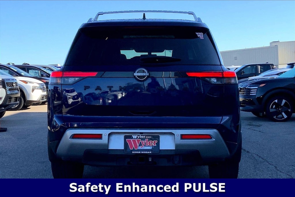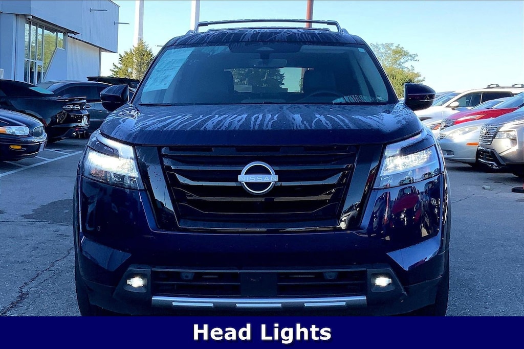 Jeff Wyler Kings Nissan is excited to offer this great 2024 Nissan Pathfinder SL in Deep Ocean Blue Pearl. Well equipped with: Black Appearance Package (Black Grille (K10) and Black Liftgate Emblems), Cargo Package (Cargo Area Protector, Cargo Net, and First Aid Kit), SL Premium Package (20" Painted Alloy Wheels, 2nd-Row Captain Chairs, 2nd-Row Rear Headrest, Bose Premium Audio System, Heated Rear Seats, Panoramic Moonroof, and Tow Hitch Receiver & Harness), 4WD, 3rd row seats: bench, 4-Wheel Disc Brakes, 6 Speakers, ABS brakes, Air Conditioning, Alloy wheels, AM/FM radio: SiriusXM, Auto High-beam Headlights, Auto-dimming Rear-View mirror, Automatic temperature control, Axle Ratio: 4.334, Black Splash Guards (Set of 4), Brake assist, Bumpers: body-color, Captain's Chairs Carpeted Floor Mats (Set of 4), Cross Bars, Delay-off headlights, Driver door bin, Driver vanity mirror, Dual front impact airbags, Dual front side impact airbags, Electronic Stability Control, Emergency communication system, Exterior Parking Camera Rear, Four wheel independent suspension, Front anti-roll bar, Front Bucket Seats, Front Center Armrest, Front dual zone A/C, Front reading lights, Fully automatic headlights, Garage door transmitter: HomeLink, Heated door mirrors, Heated Front Bucket Seats, Heated front seats, Heated steering wheel, Illuminated entry, Knee airbag, Leather steering wheel, Leather-Appointed Seating Surfaces, LED Fog Lamps, Low tire pressure warning, Navigation system: NissanConnect with Navigation and Services, Nissan USB Charging Cable Set, NissanConnect featuring Apple CarPlay and Android Auto, NissanConnect w/Navigation & Services, Occupant sensing airbag, Outside temperature display, Overhead airbag, Overhead console, Panic alarm, Passenger door bin, Passenger vanity mirror, Power door mirrors, Power driver seat, Power Liftgate, Power passenger seat, Power steering, Power windows, Radio data system, Radio: AM/FM Audio System, Rear air conditioning, Rear anti-roll bar, Rear reading lights, Rear seat center armrest, Rear side impact airbag, Rear window defroster, Rear window wiper, Reclining 3rd row seat, Remote keyless entry, Security system, Speed control, Speed-sensing steering, Split folding rear seat, Spoiler, Steering wheel mounted audio controls, Tachometer, Telescoping steering wheel, Tilt steering wheel, Traction control, Trip computer, Turn signal indicator mirrors, Variably intermittent wipers, and Wheels: 18" x 8J Machined Alloy.Ask about available certifications.