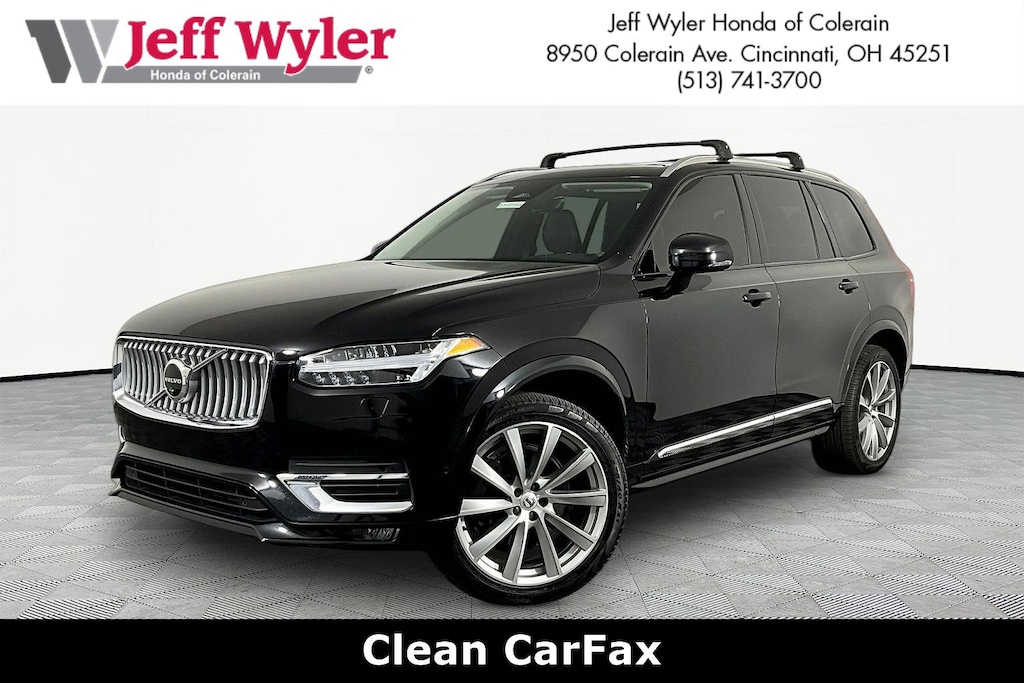 Jeff Wyler Honda of Colerain is pleased to offer this gorgeous 2023 Volvo XC90 B6 Plus 7-Seater in Onyx Black Metallic. Well equipped with: 10 Speakers, 3rd row seats: bucket, 4-Wheel Disc Brakes, ABS brakes, Air Conditioning, Alloy wheels, AM/FM radio: SiriusXM, Anti-whiplash front head restraints, Apple CarPlay, Auto High-beam Headlights, Auto-dimming door mirrors, Auto-dimming Rear-View mirror, Automatic temperature control, Brake assist, Bumpers: body-color, Delay-off headlights, Driver door bin, Driver vanity mirror, Dual front impact airbags, Dual front side impact airbags, Electronic Stability Control, Emergency communication system: Volvo Cars App w/4 Year Subscription, Exterior Parking Camera Rear, Four wheel independent suspension, Front anti-roll bar, Front Bucket Seats, Front Center Armrest w/Storage, Front dual zone A/C, Front fog lights, Front reading lights, Fully automatic headlights, Garage door transmitter: HomeLink, Genuine wood dashboard insert, Genuine wood door panel insert, Headlight cleaning, Heated door mirrors, Heated Front Bucket Seats, Heated front seats, Heated rear seats, Heated steering wheel, Illuminated entry, Integrated rear child seats, Knee airbag, Leather Shift Knob, Leather Upholstery, Low tire pressure warning, Memory seat, Navigation System, Occupant sensing airbag, Outside temperature display, Overhead airbag, Panic alarm, Passenger door bin, Passenger vanity mirror, Power door mirrors, Power driver seat, Power moonroof, Power passenger seat, Power steering, Power windows, Radio data system, Radio: High Performance Audio System, Rain sensing wipers, Rear air conditioning, Rear anti-roll bar, Rear dual zone A/C, Rear fog lights, Rear reading lights, Rear seat center armrest, Rear window defroster, Rear window wiper, Remote keyless entry, Security system, Speed control, Speed-sensing steering, Split folding rear seat, Spoiler, Steering wheel mounted audio controls, Tachometer, Telescoping steering wheel, Traction control, Trip computer, Turn signal indicator mirrors, Variably intermittent wipers, and Wheels: 20" 5-Spoke Black Diamond Cut Alloy.